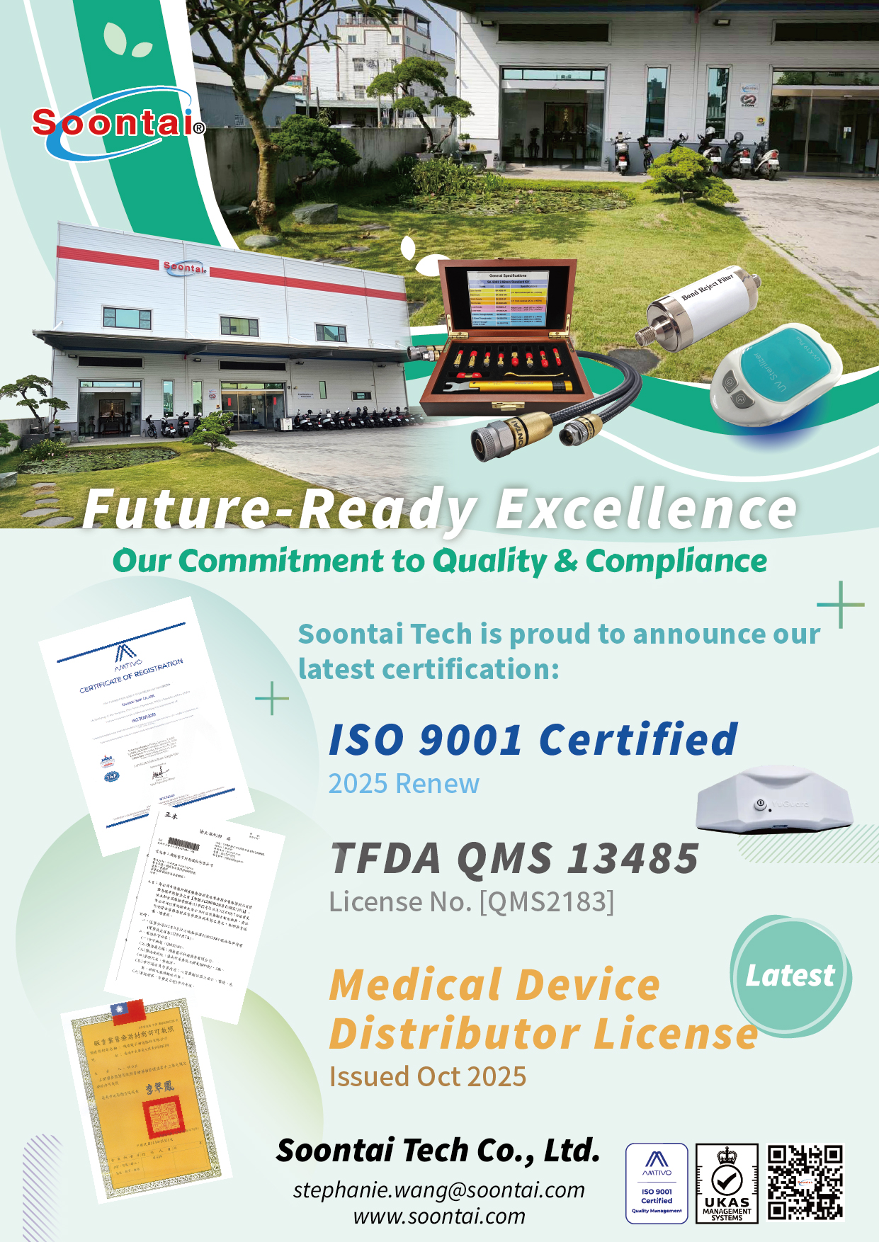 Founded in 1994, Soontai is headquartered in Tainan City, Taiwan. We design, manufacture and support wide portfolio of filter and accessories in CATV, SMATV, DVB, MMDS, LTE, DOCSIS , MoCA, and G.hn systems. Our entire team is dedicated to continuous innovation, quality consistency, solid reliability, and customer oriented services.